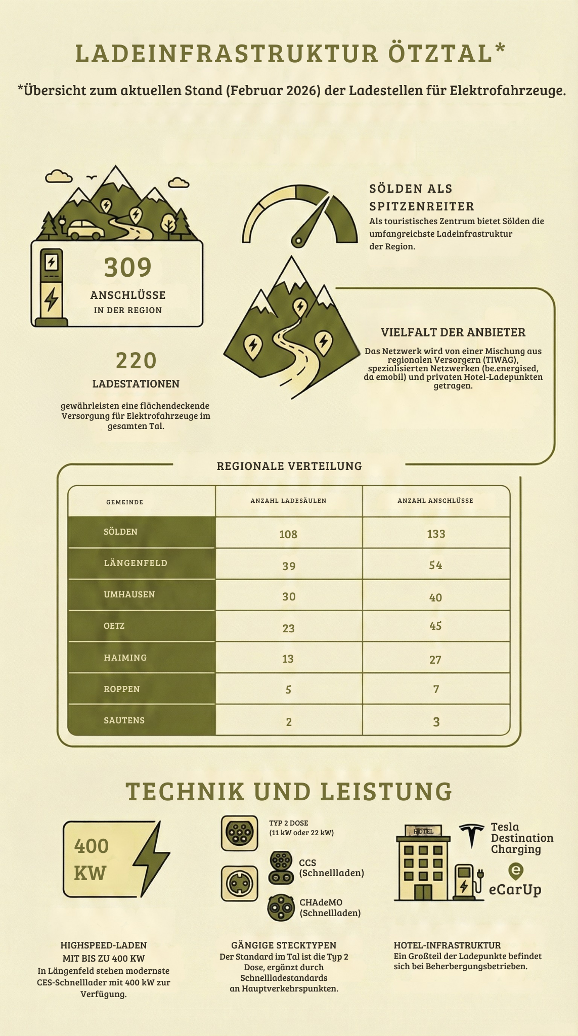 Die Übersicht der öffentlichen E-Ladestationen zeigt, wie dicht das Netz im Tal inzwischen ausgebaut ist. Über alle Gemeinden inklusive Roppen als Teil des Planungsverbandes Ötztal stehen mehr als 300 Ladeanschlüsse zur Verfügung. Damit ist das Ötztal flächendeckend gut aufgestellt.